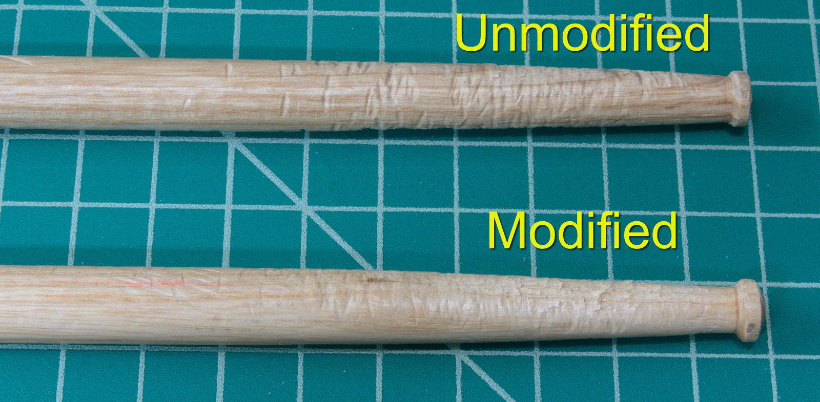 - The unmodified stick had more grain lifting and a chip lost.