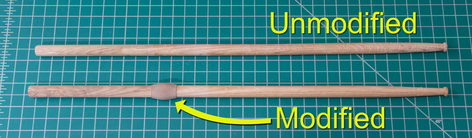 The lower stick is modified with the 'nub' that controls both the striking side of the stick and the fulcrum of the stick. Both of these increase tonal consistency and longevity of the stick.