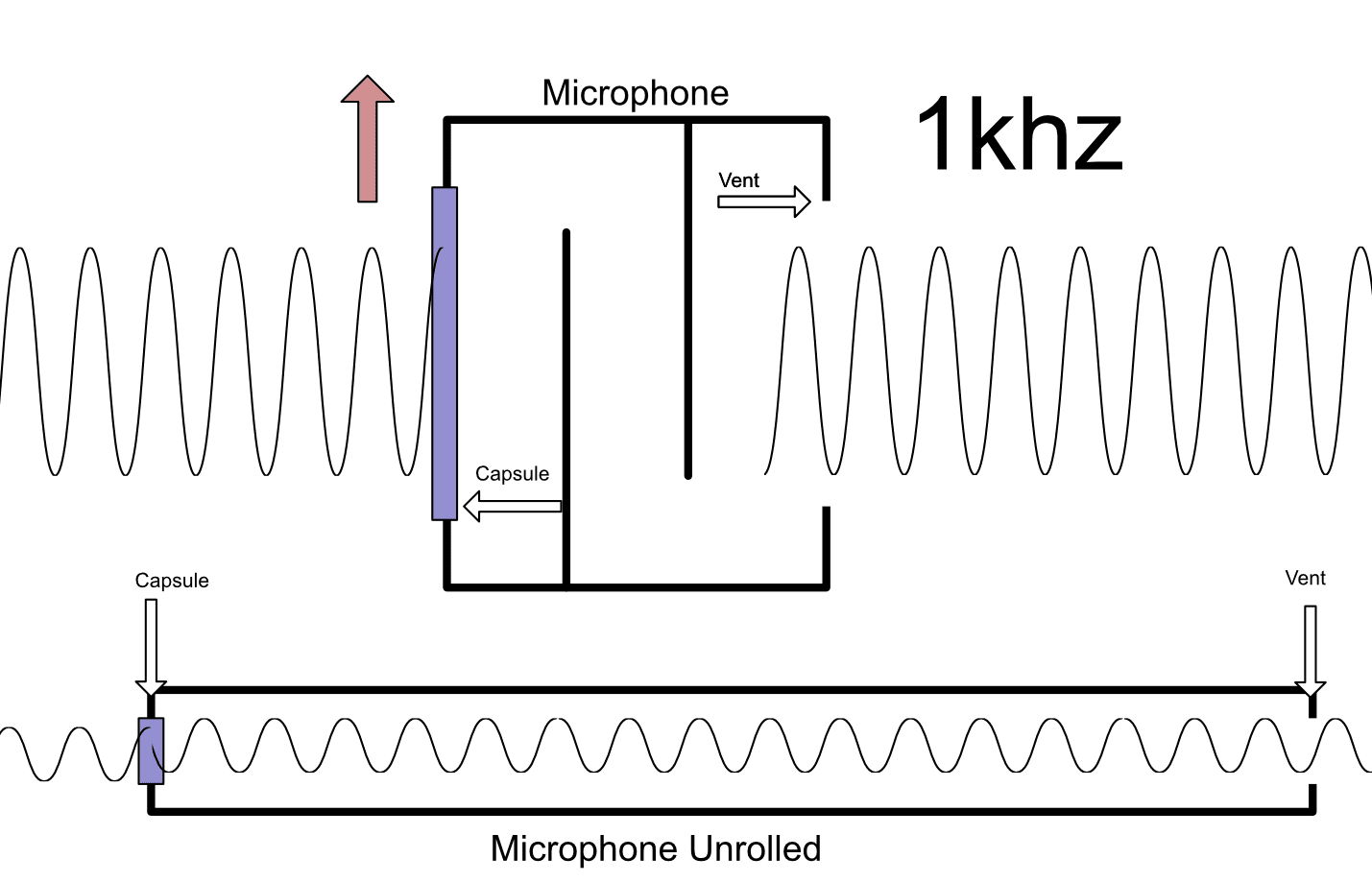 The microphone has the venting though! So the sound enters through the vents, travels through a pathway that makes the sound travel a bit more distance and voila! Cancellation! You can see in the 'unrolled' pathway that the rear-entering sound arrives at the capsule at the inverse polarity of the front-entering sound. These 2 pressure waves cancel each other out and the capsule doesn't respond (much).