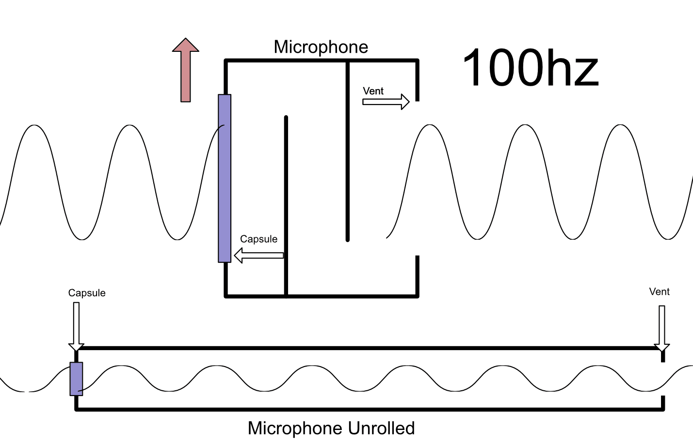 Let's look at the example above. We have a 100hz wave going from left to right to the microphone. The wave hits the capsule right at a high point in the pressure wave.