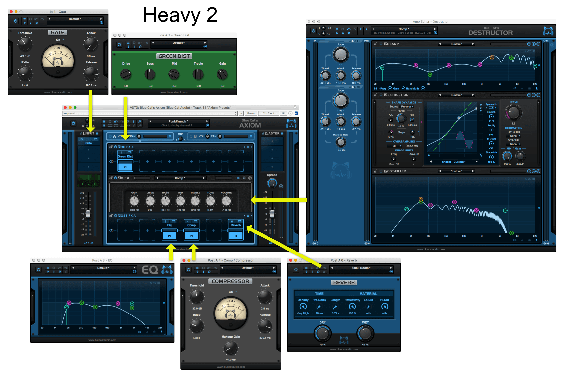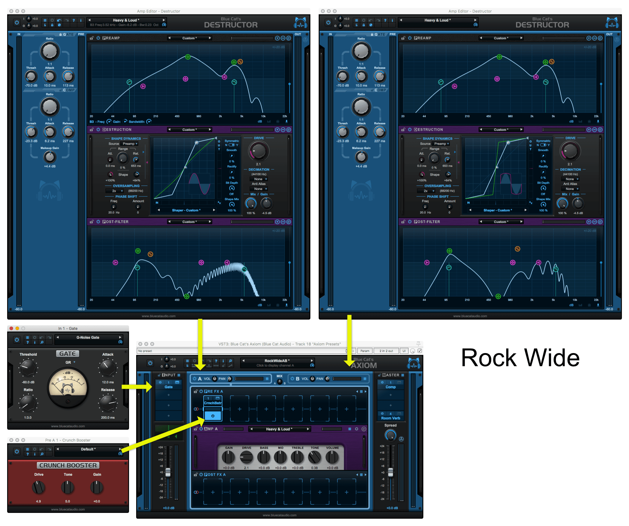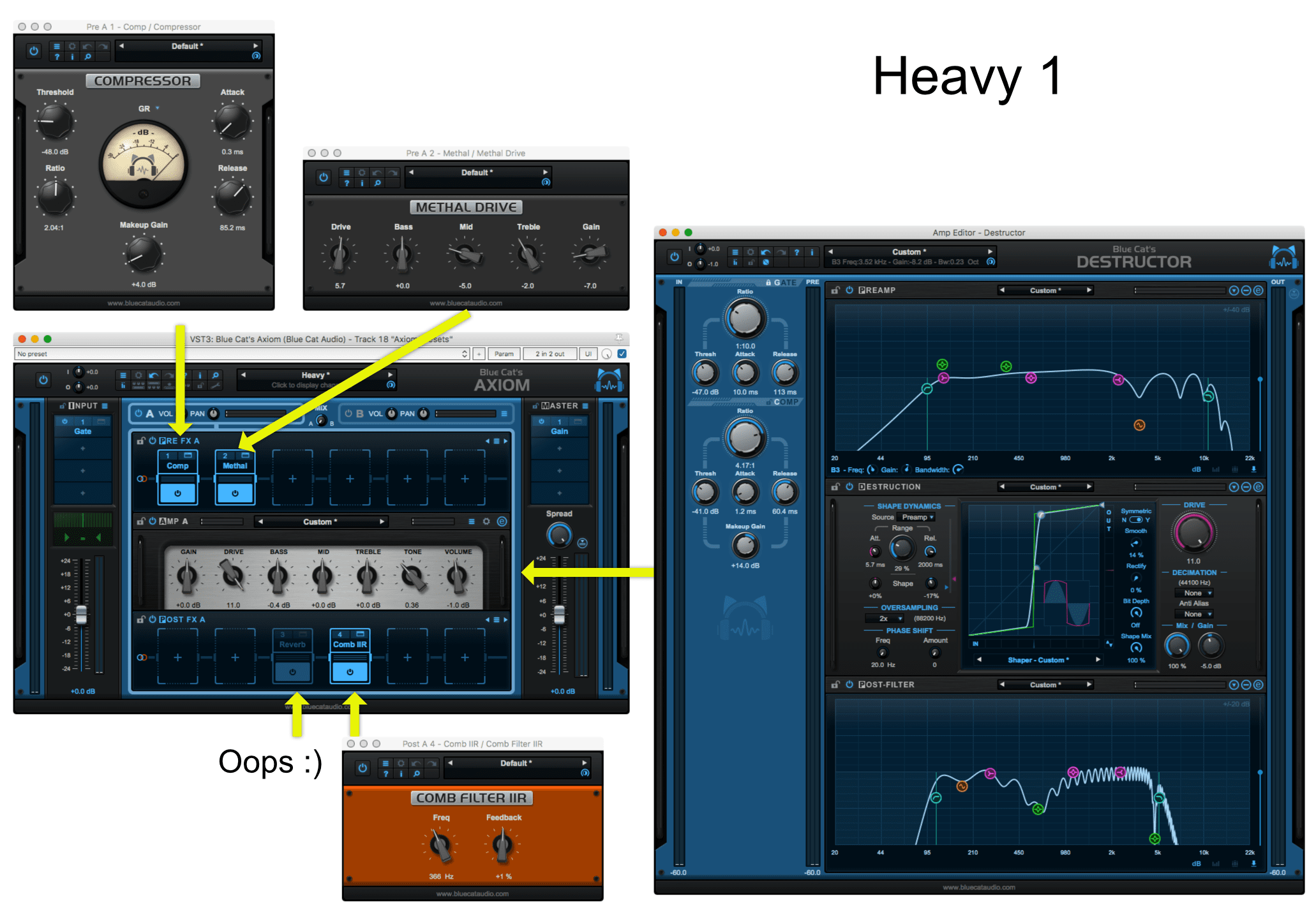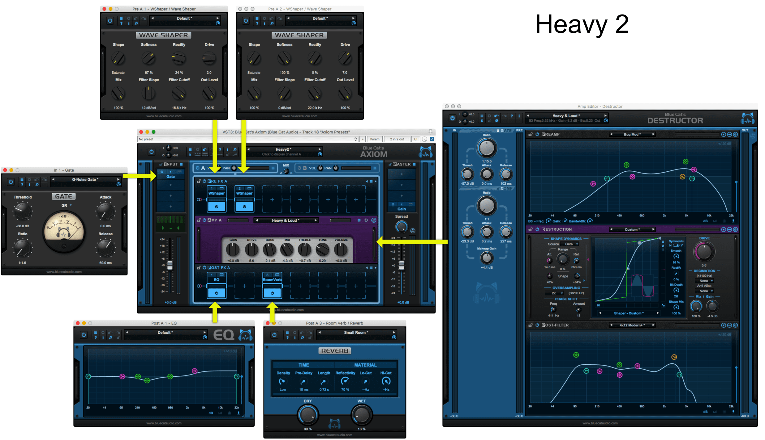 - A gate at the beginning - This cuts out a lot of the guitar noise, but not all of it. This gate is a bit chattery, and I don't use the default gate at all in Axiom. I only subbed this in for distribution of the presets. Replace it with something else, please.