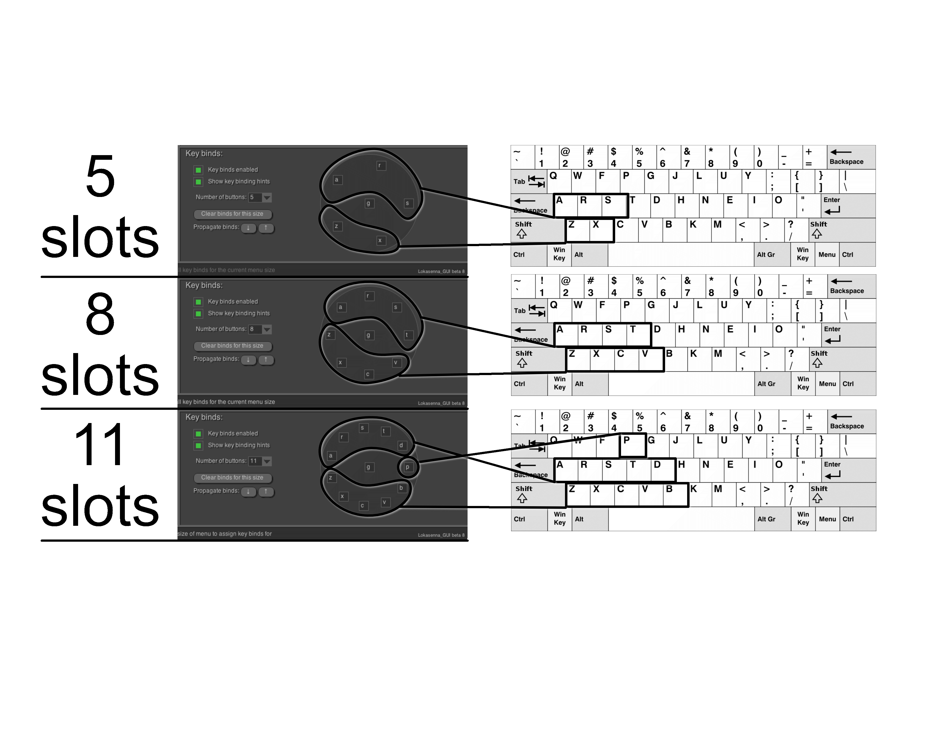 - 11 - The obvious progression goes to "A R S T D" and "Z X C V B". There is something in here that is new though: P. I do not wish to extend my keys to the right because my left hand cannot comfortably reach those. I do not like using the keys "Q" and "W" because those are difficult for my pinky to press. After 10 slots, I begin to extend with the letter "P". My 12th slot (not shown) is "F".