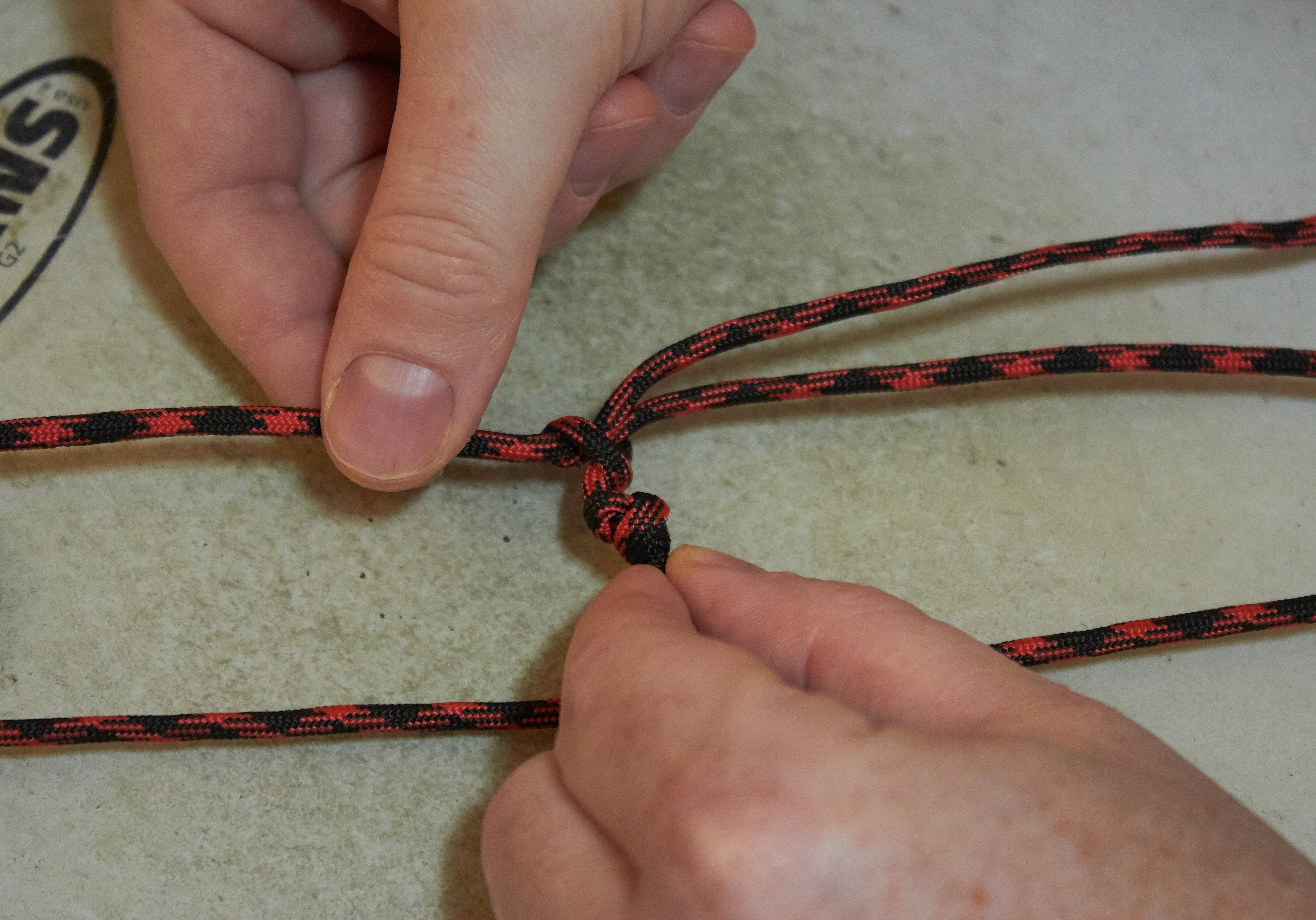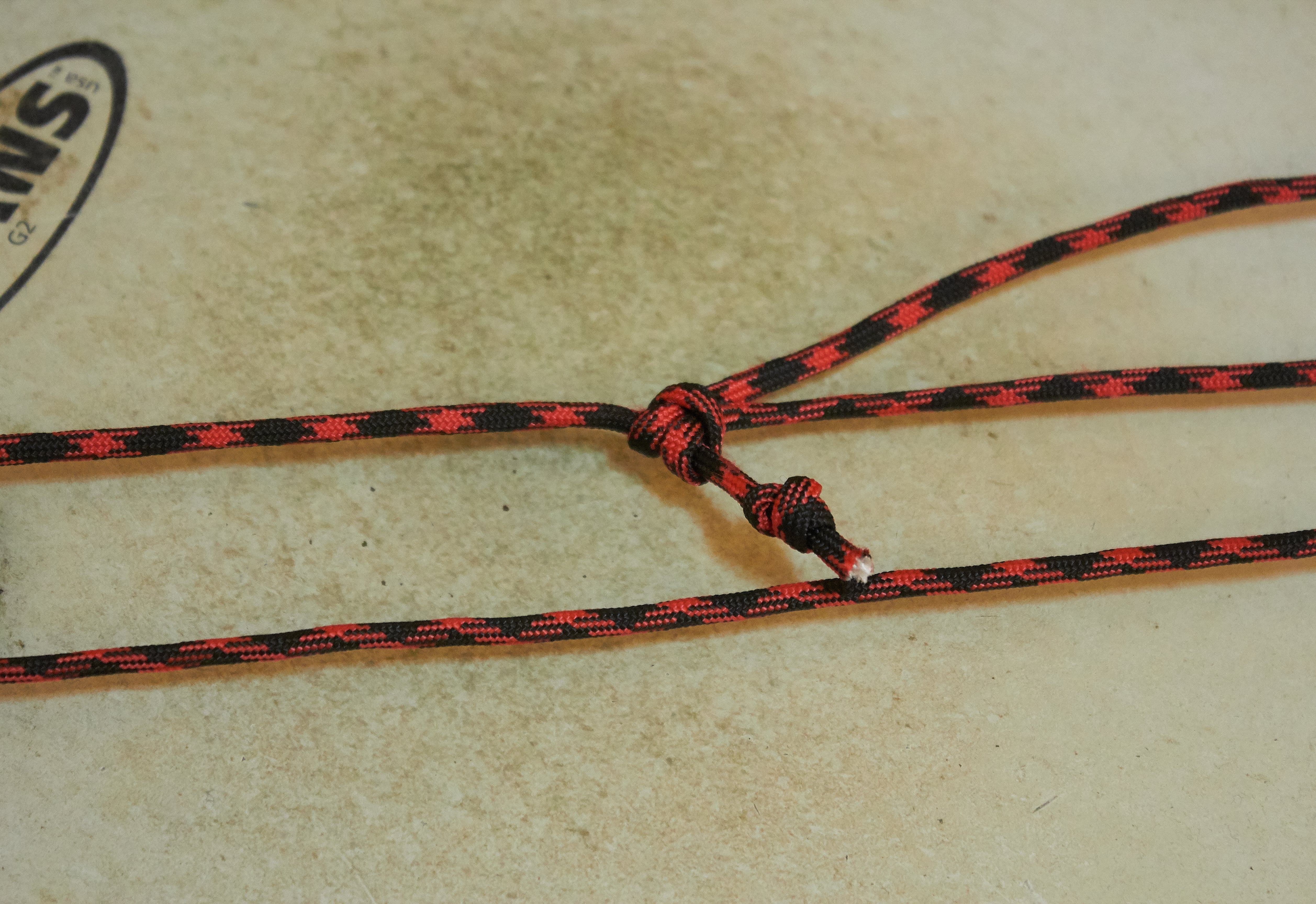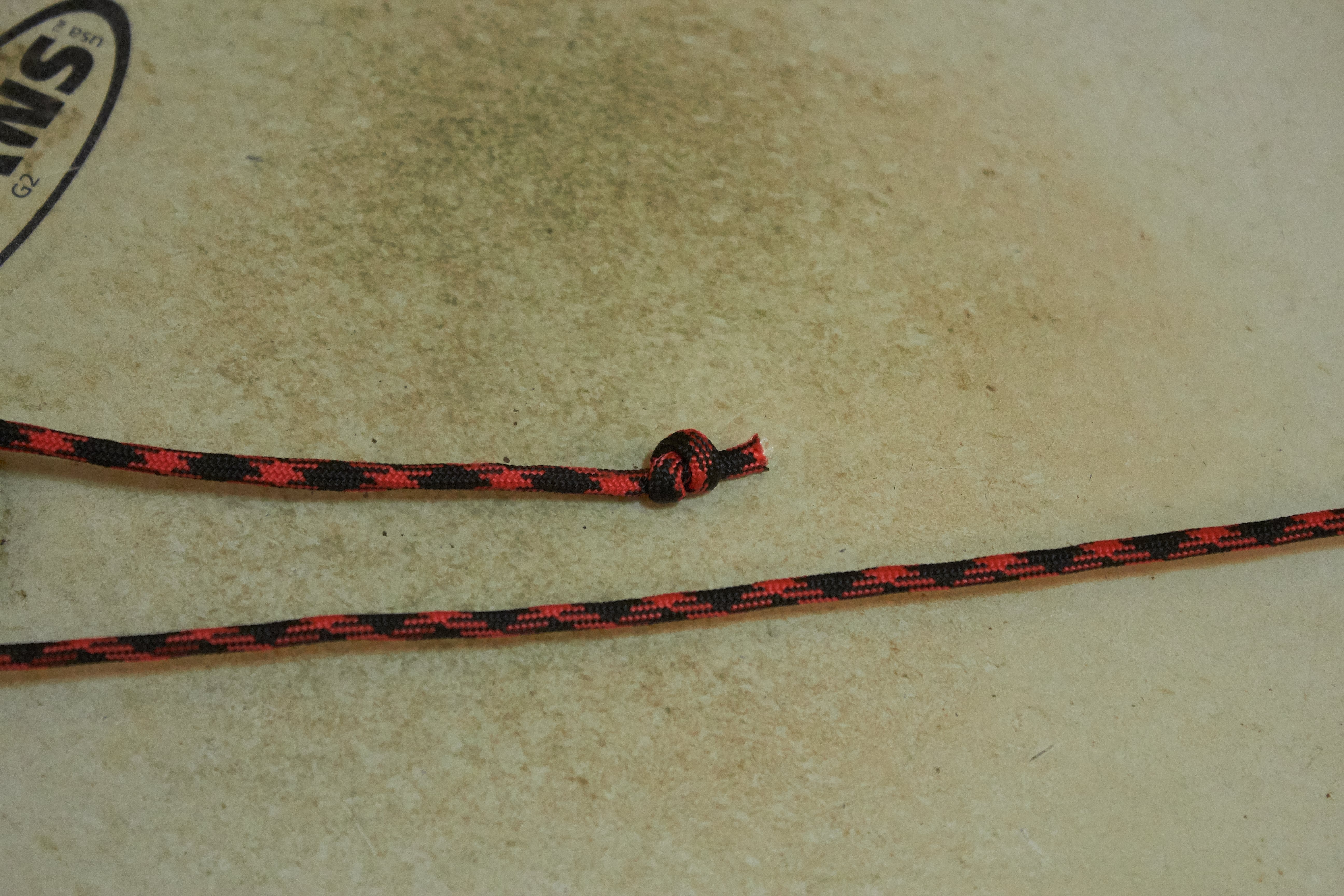 At the end of the cord that came through the snare drum create a knot. I use a double overhand knot because it's both secure and easy to undo if needed.