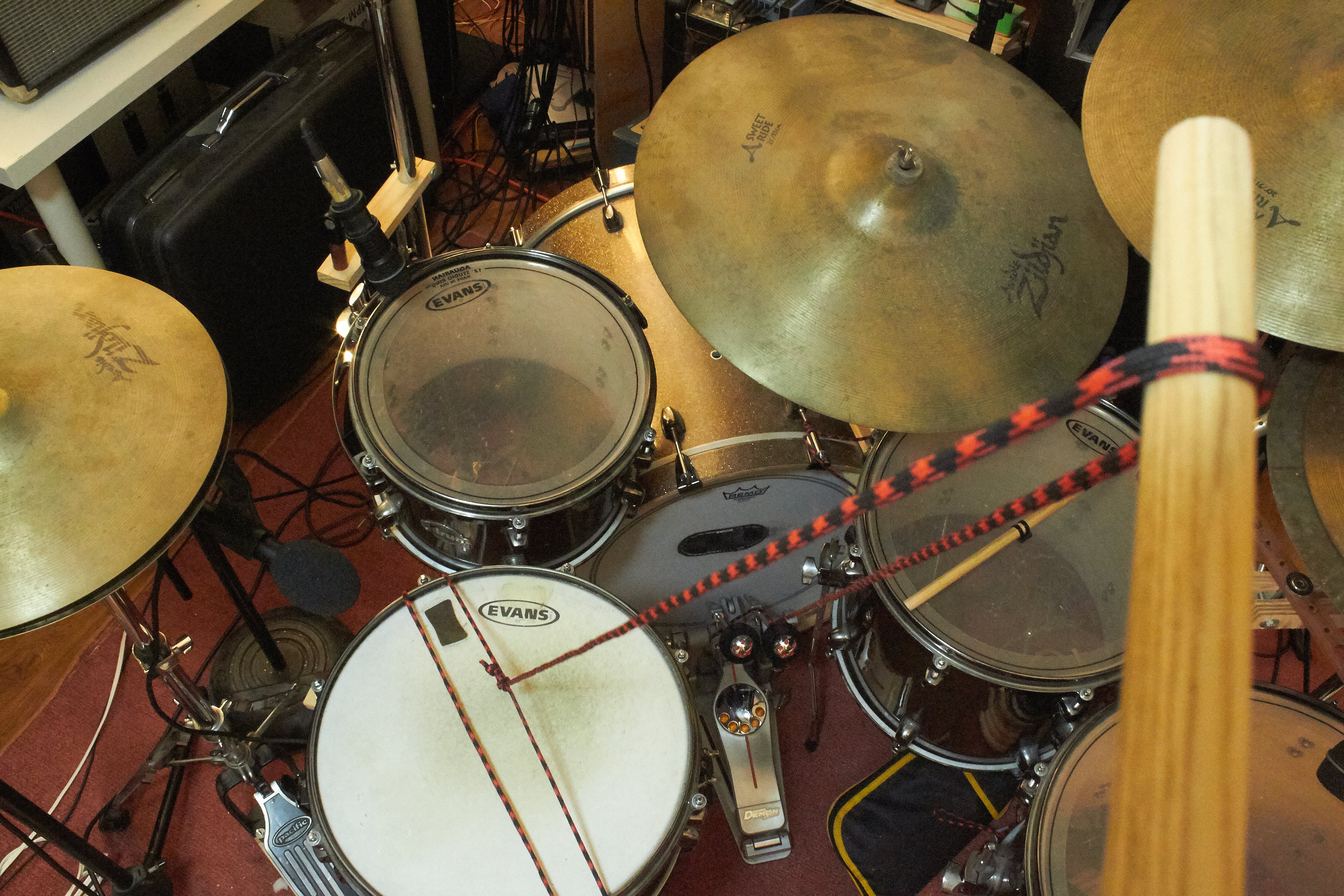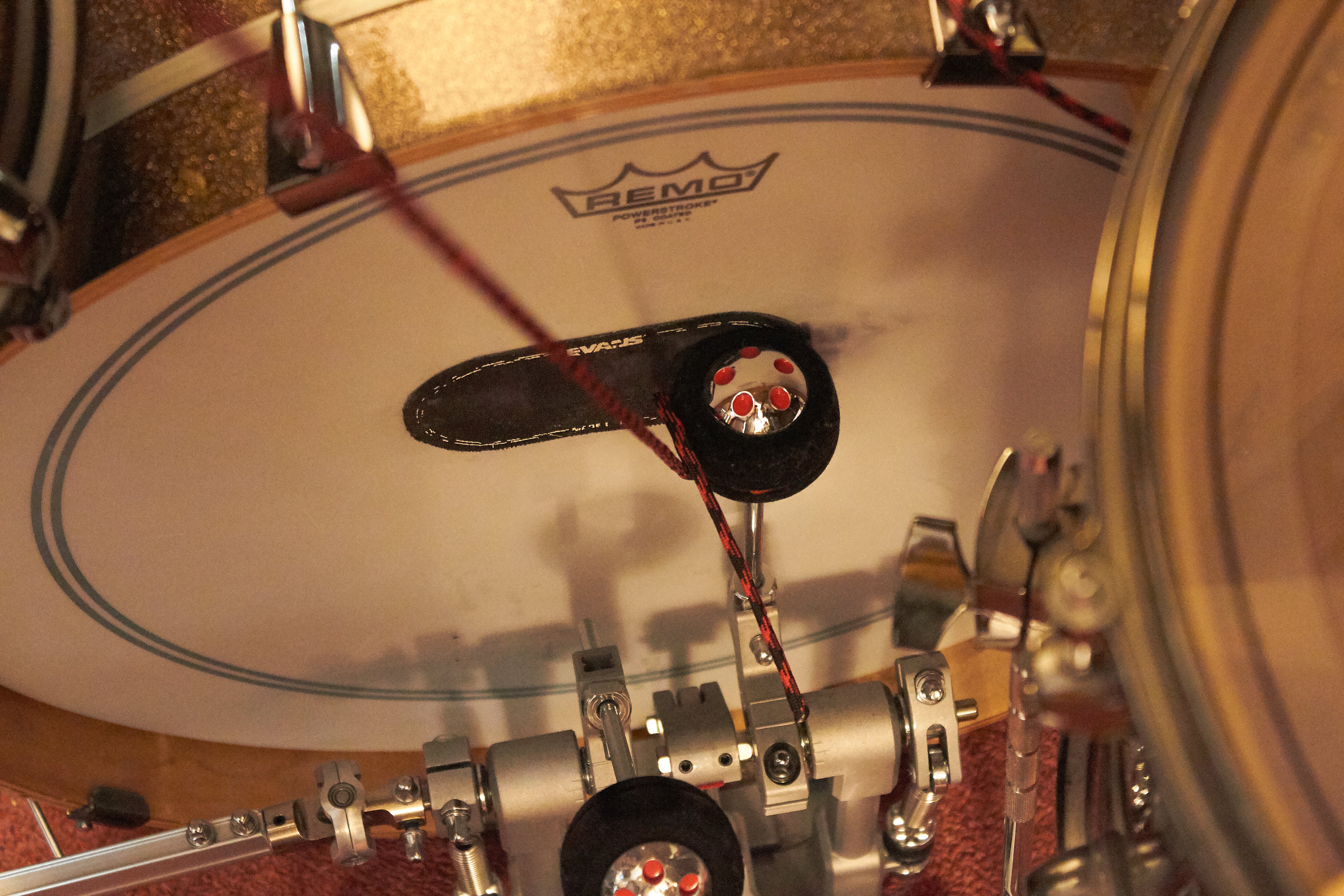 Another thing you can do that works rather well is to tie you lines to the top two lugs of the kick drum like in the image above. This lets you move the line more accurately when trying to pull it in front of the kick drum.