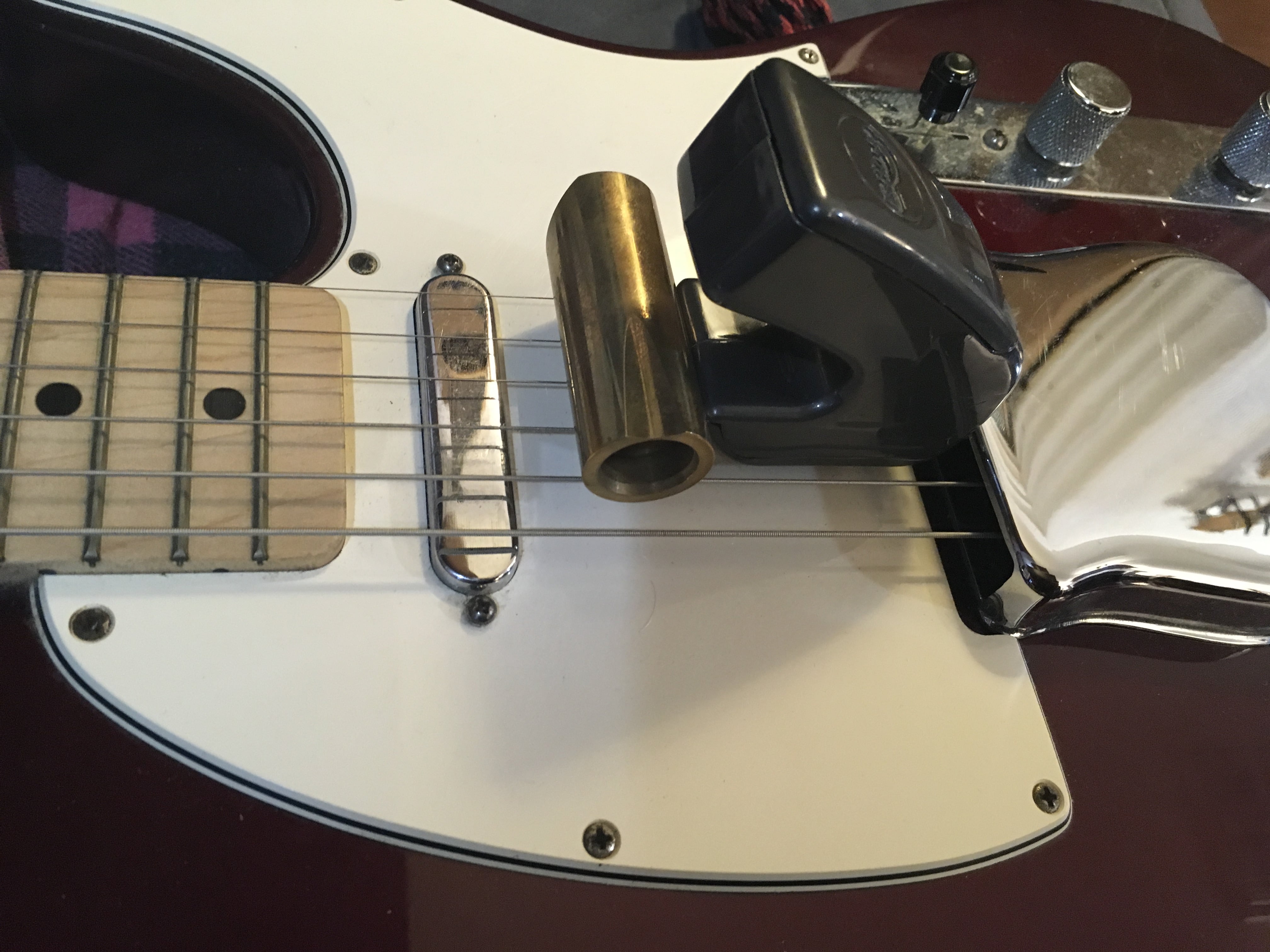 I placed the EBow against the ashtray cover, and the slide against the EBow. This gave me a repeatable setup to make a ~977hz test signal straight out of a guitar.