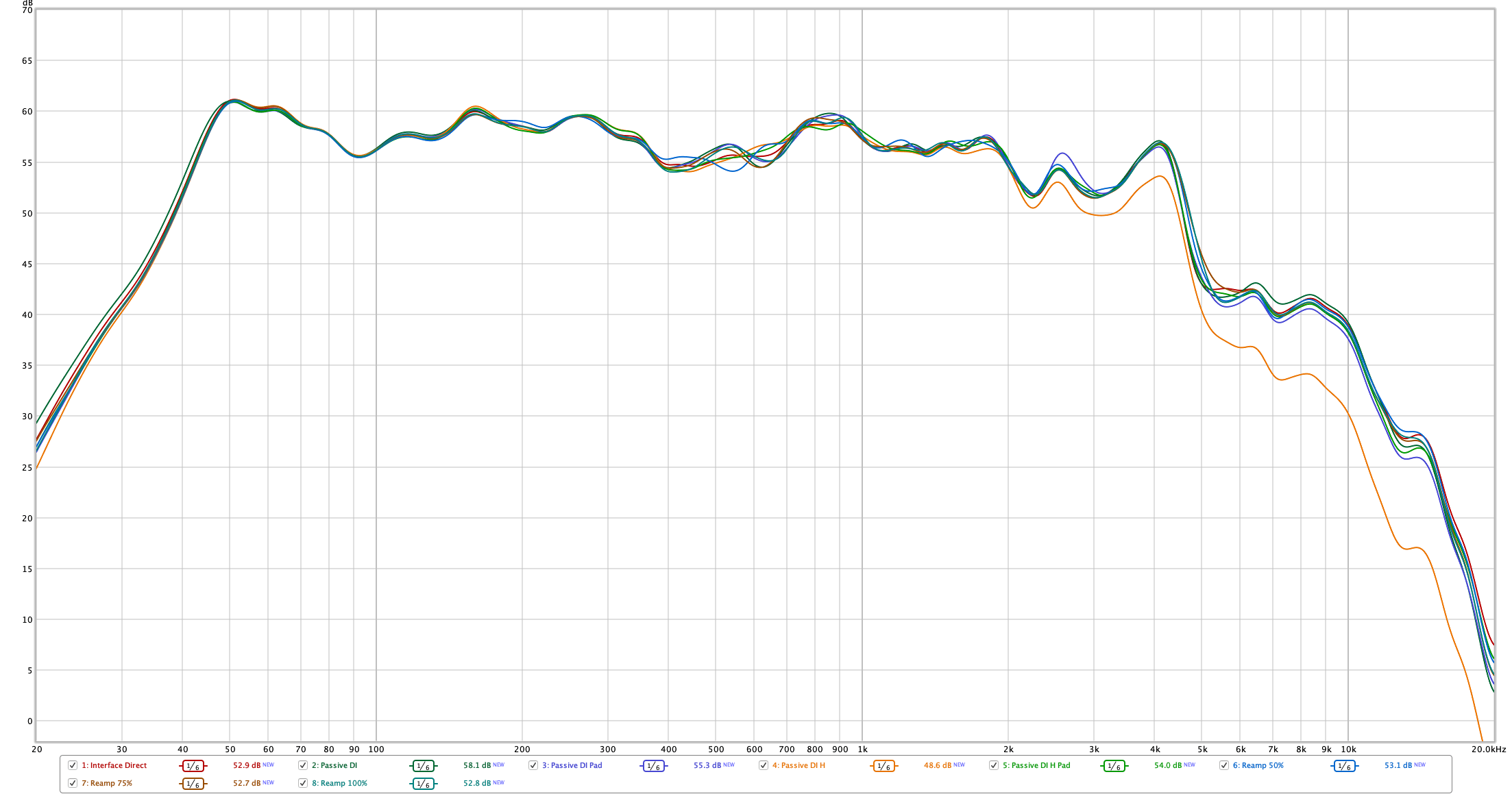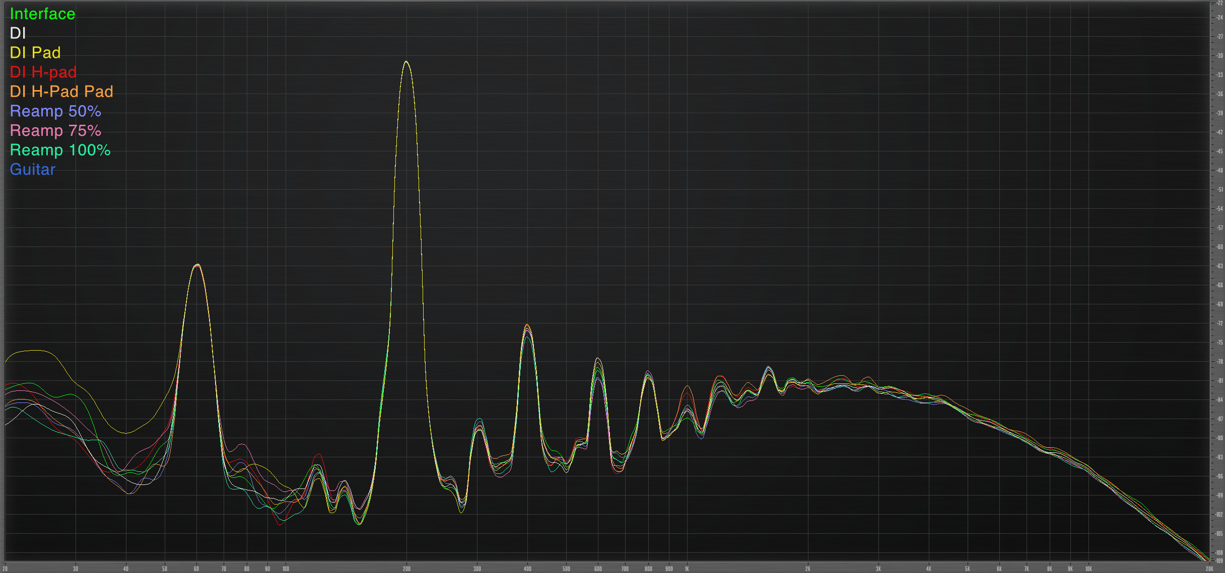 • Passive DI -15dB pad onboard with 270Ω/47Ω H-Pad cable - -5.82dB (began to clip, level too low!)