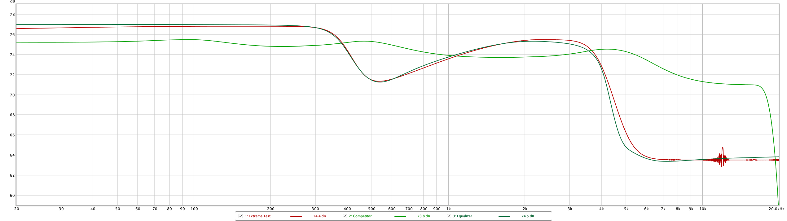 This is testing AVA MC with all bands set equally so that they act equally. A sine sweep is sent through the product and the amplitude response is recorded. If there is some variation in how the bands react, such as some bands being 'more sensitive', then this will show it.