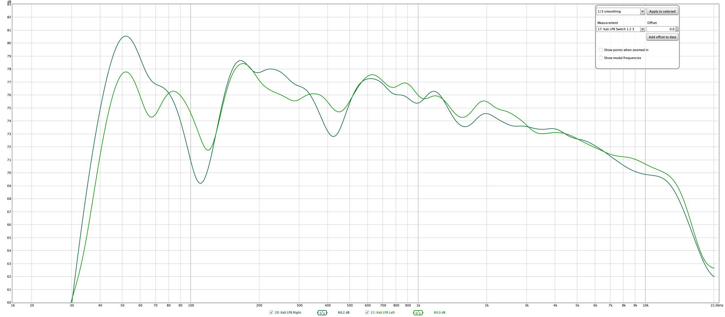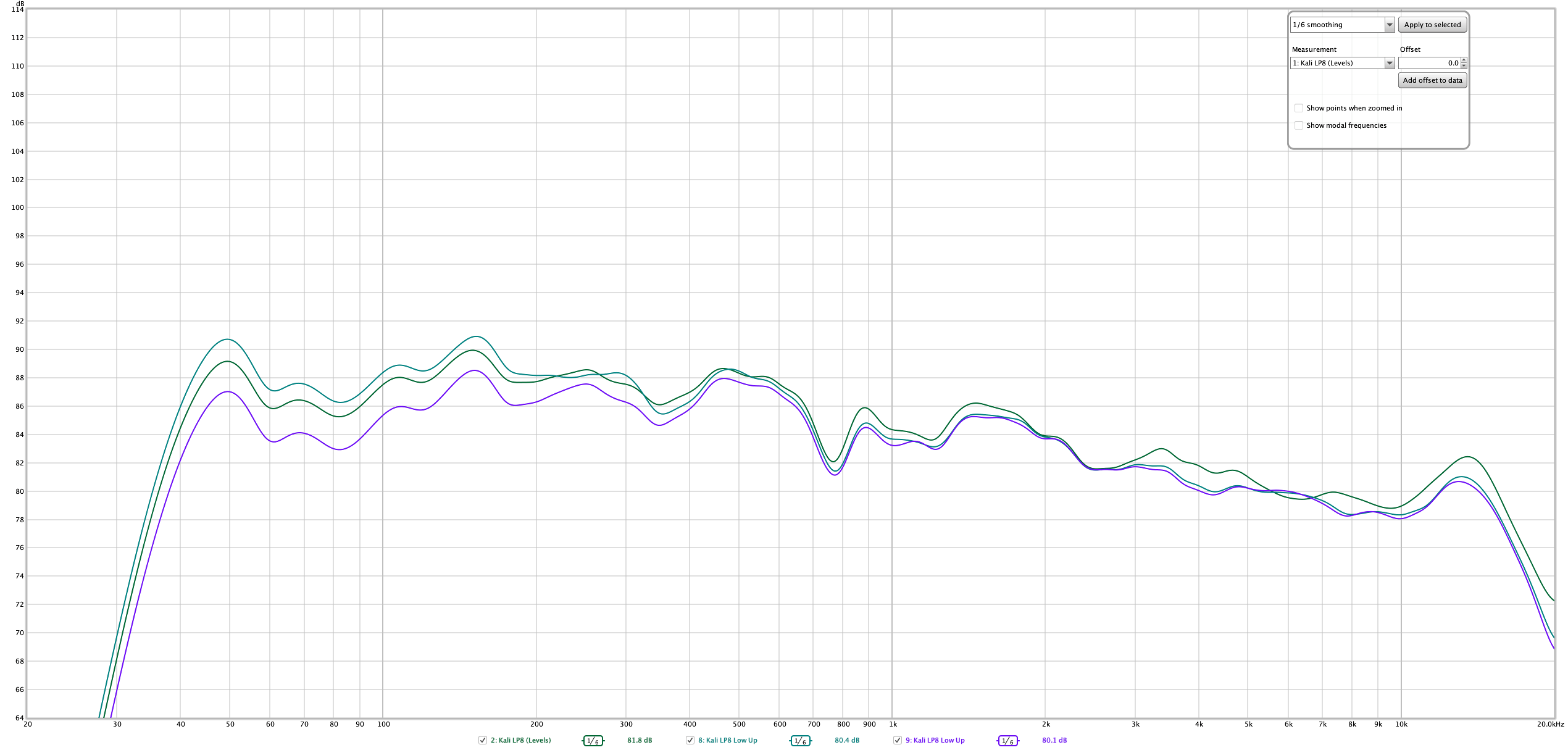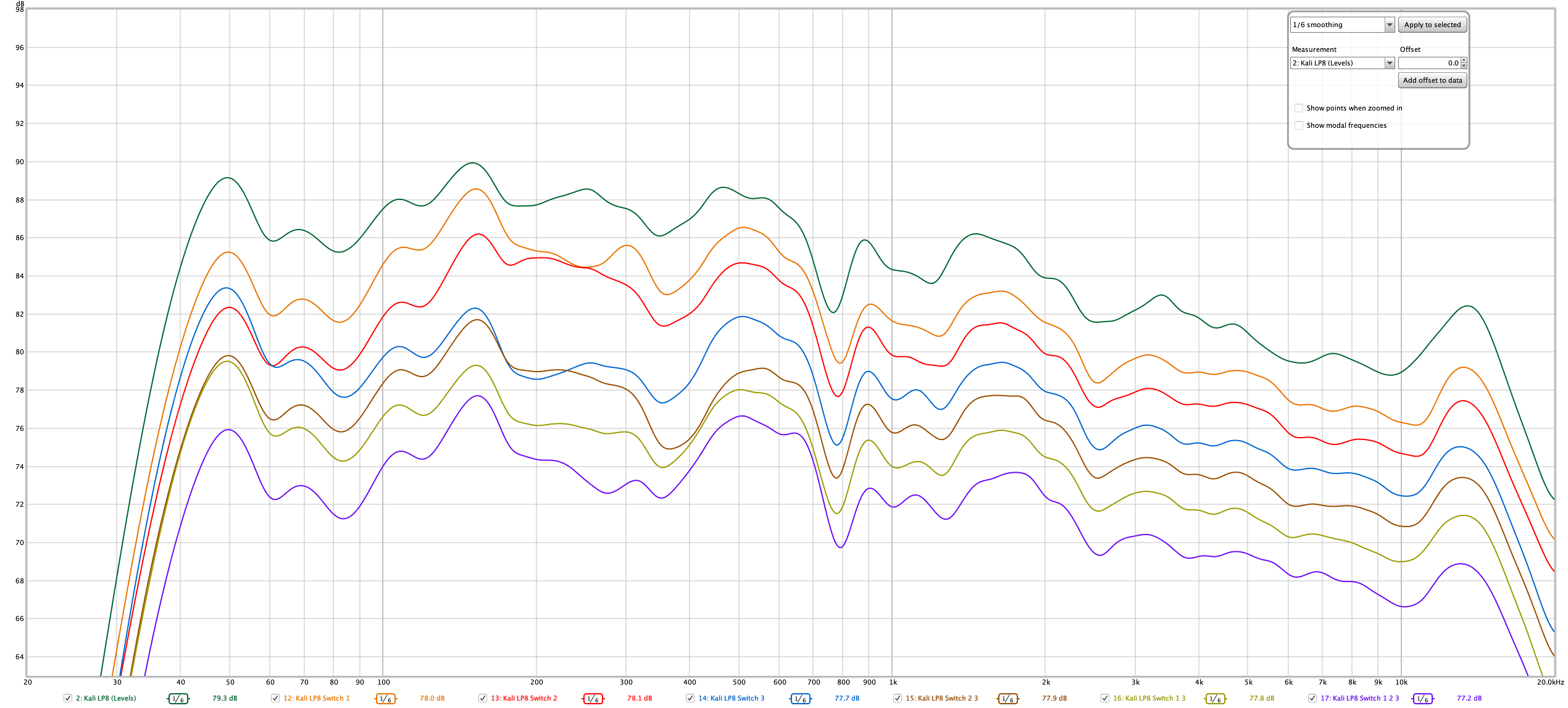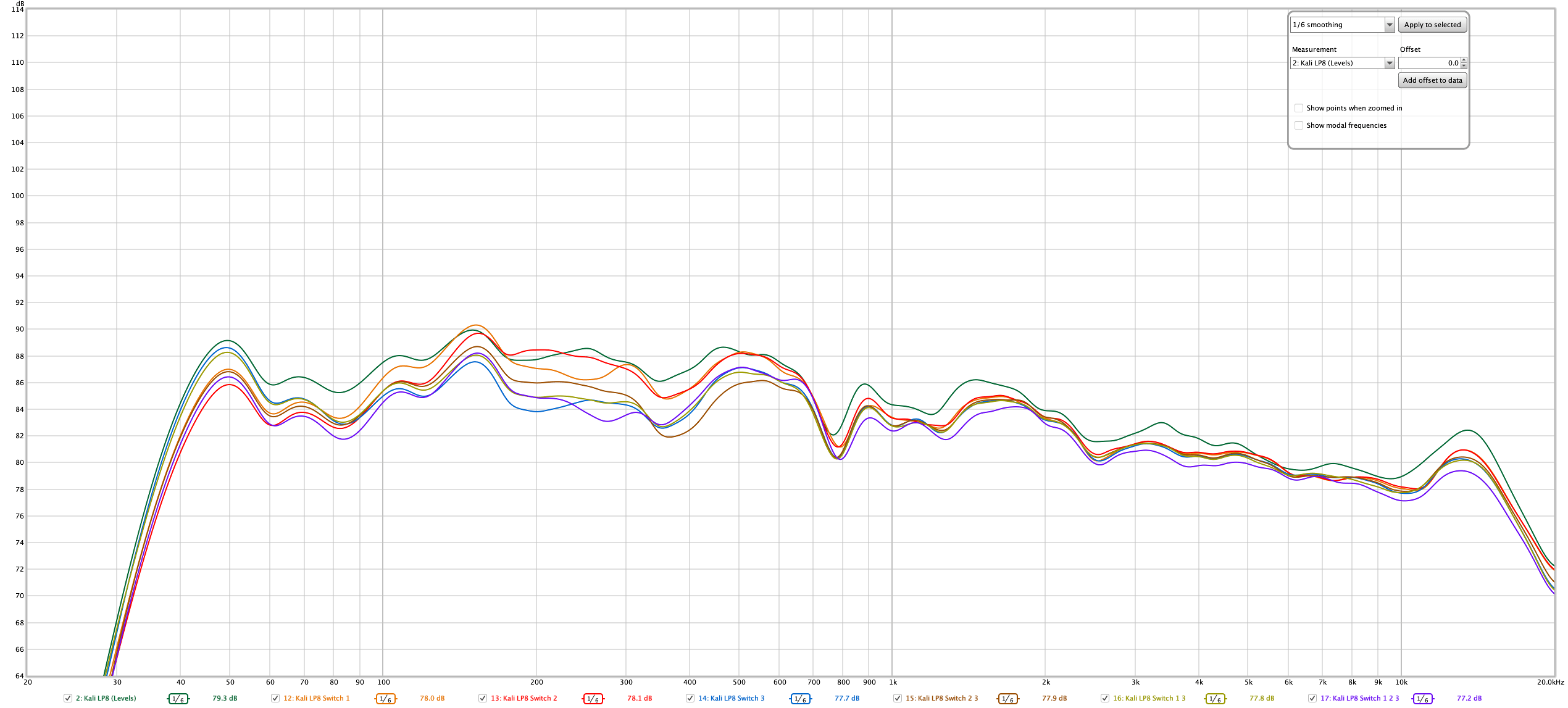 All graphs are presented with 1/6 octave smoothing for clarity. I've included the REW files so that you can inspect my data yourself.