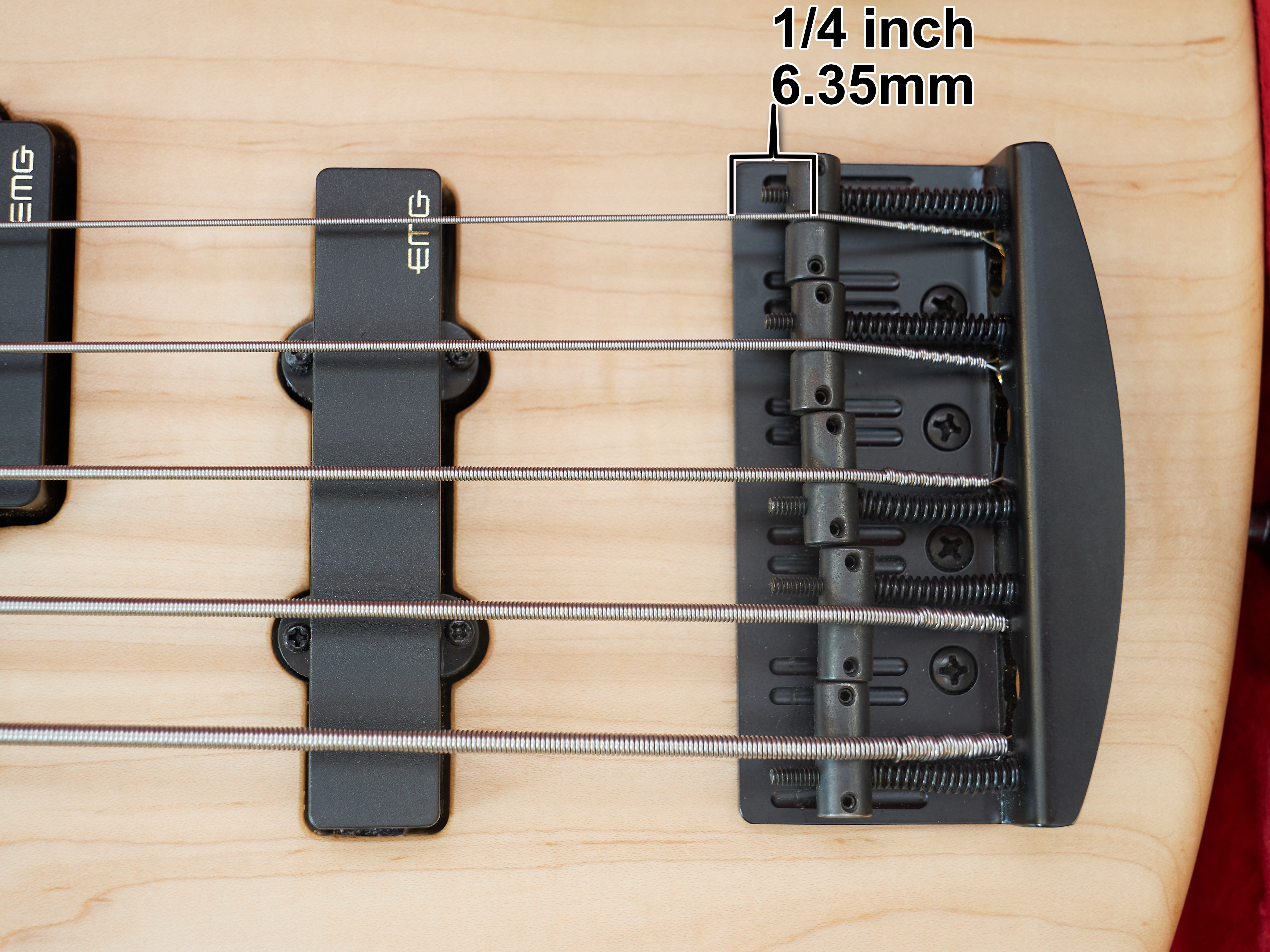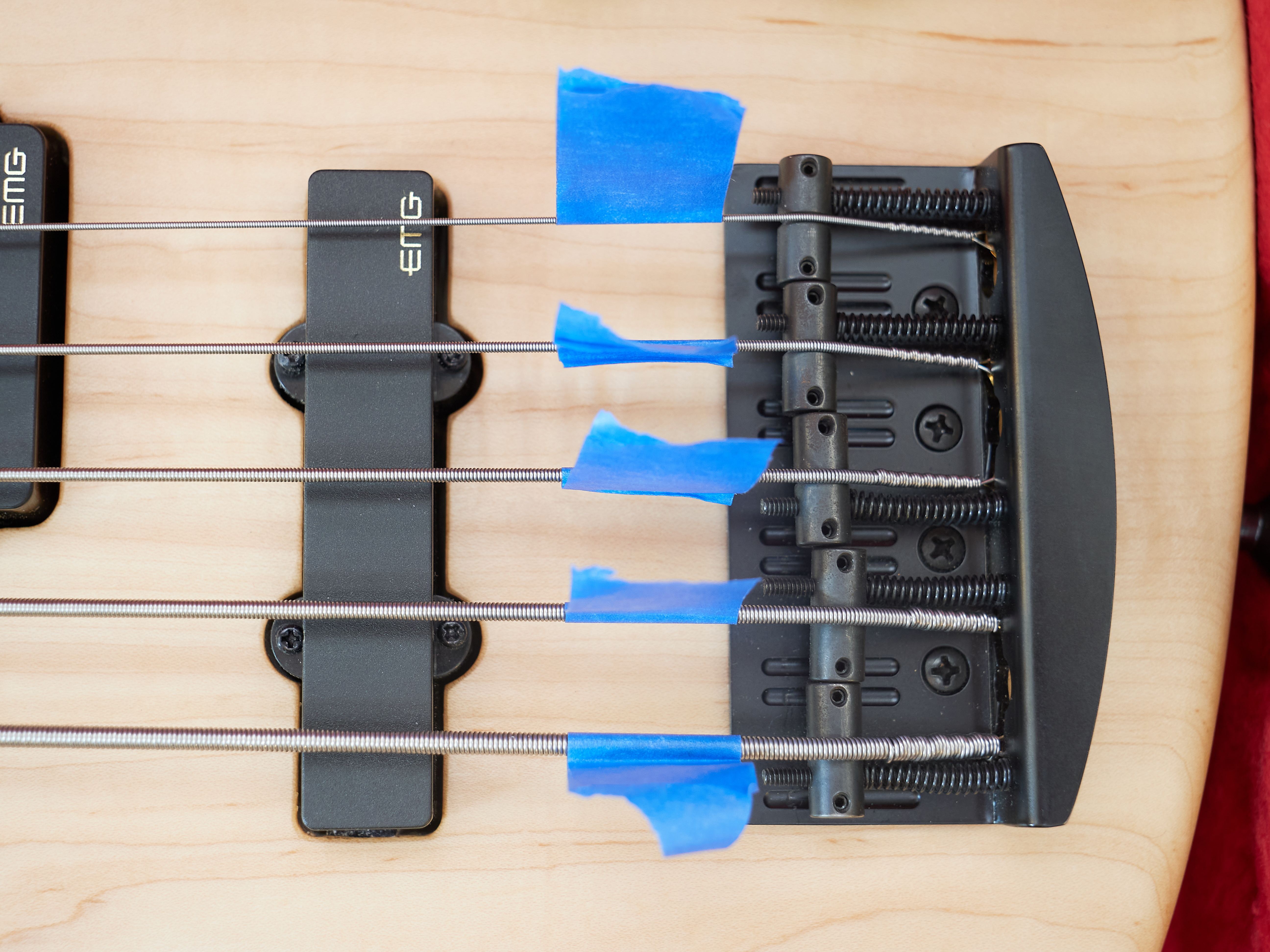 The bridge on this bass allows the strings to come out through a notch. If you have a string-through-bridge or string-through-body bass, then you will want to BE CAREFUL about how you mark the strings. You do not want your mark being rubbed off or shifting while removing the strings.