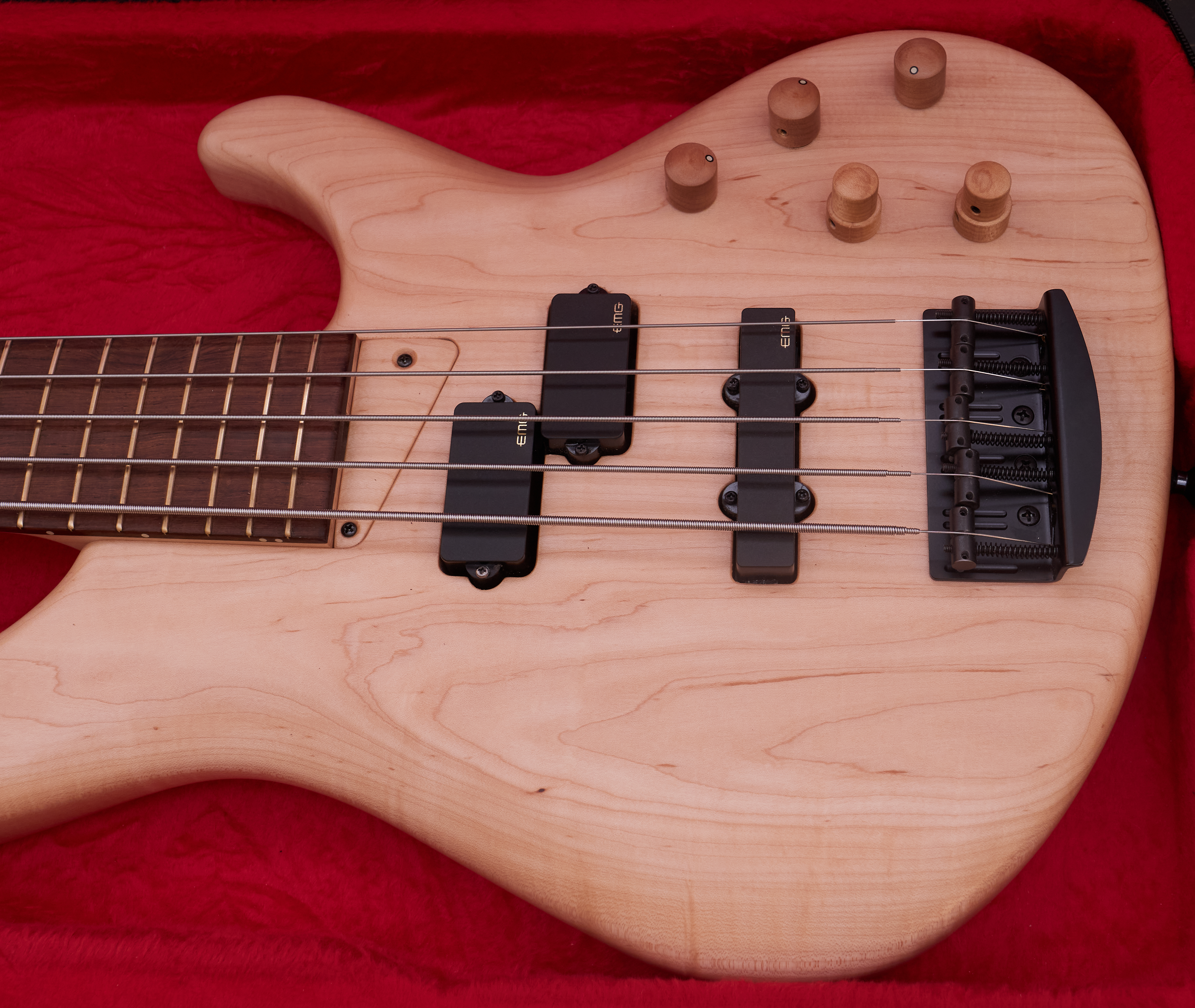 - Note that the saddles are further "forward" (towards the neck) than the previous photos. This is properly intonated for this bass.