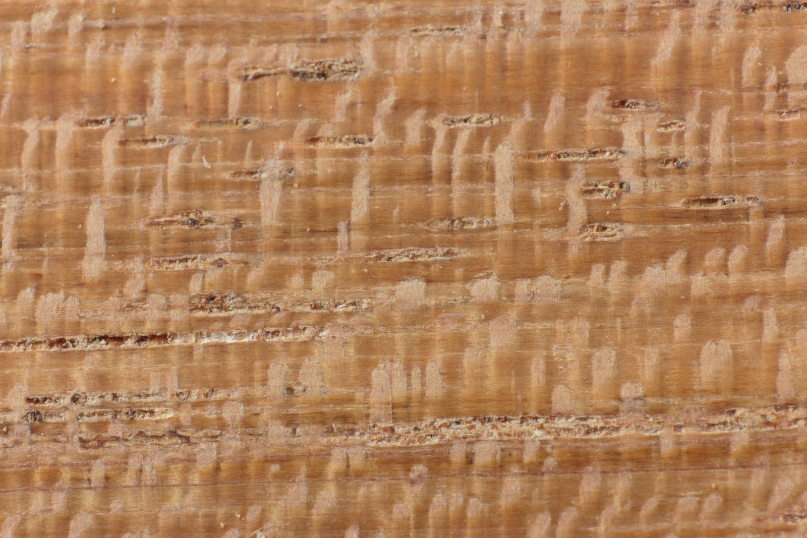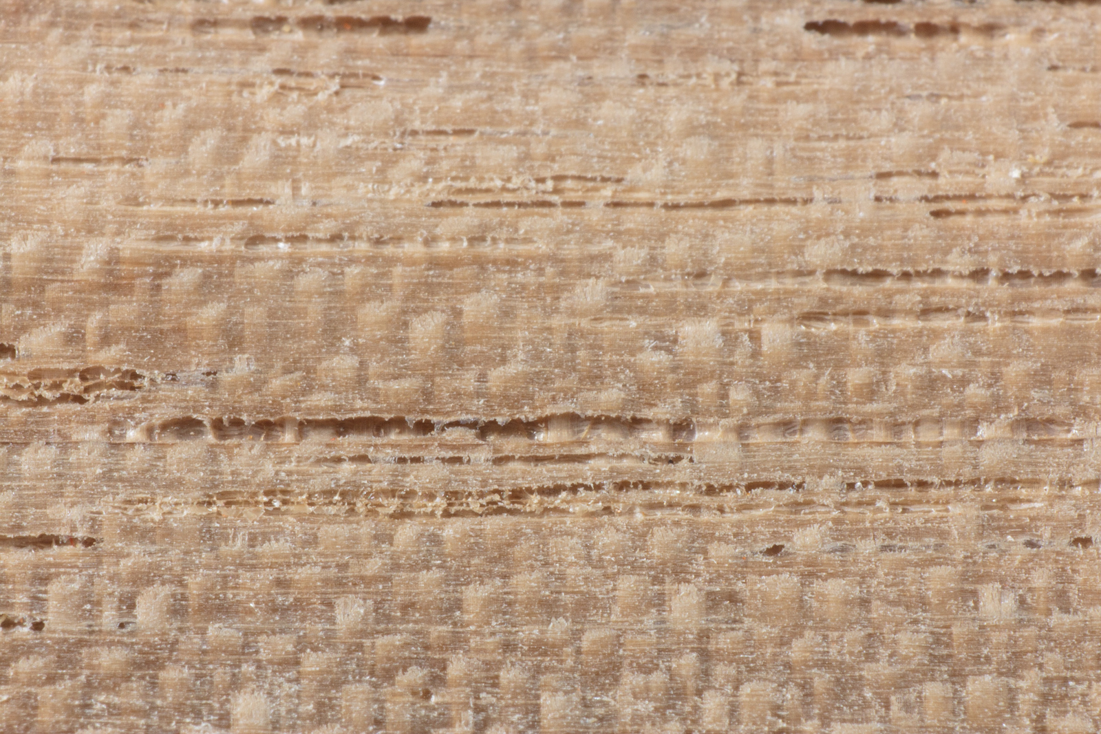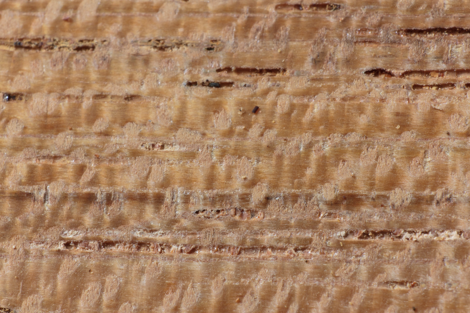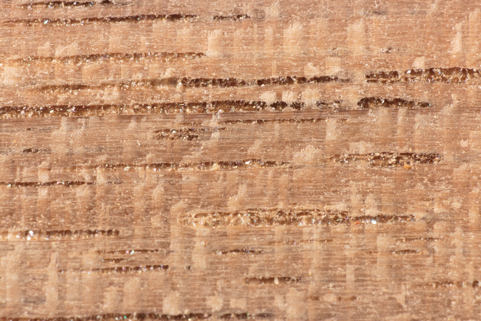 This is the example where you can see where the tear out in all of the previous examples stems from. There's vessels in the wood that are partially filled. Other cutting methods remove this filling (of what I assume is dried sap and/or resin). The 66° plane blade cuts very smoothly and leaves these vessel's contents mostly intact.