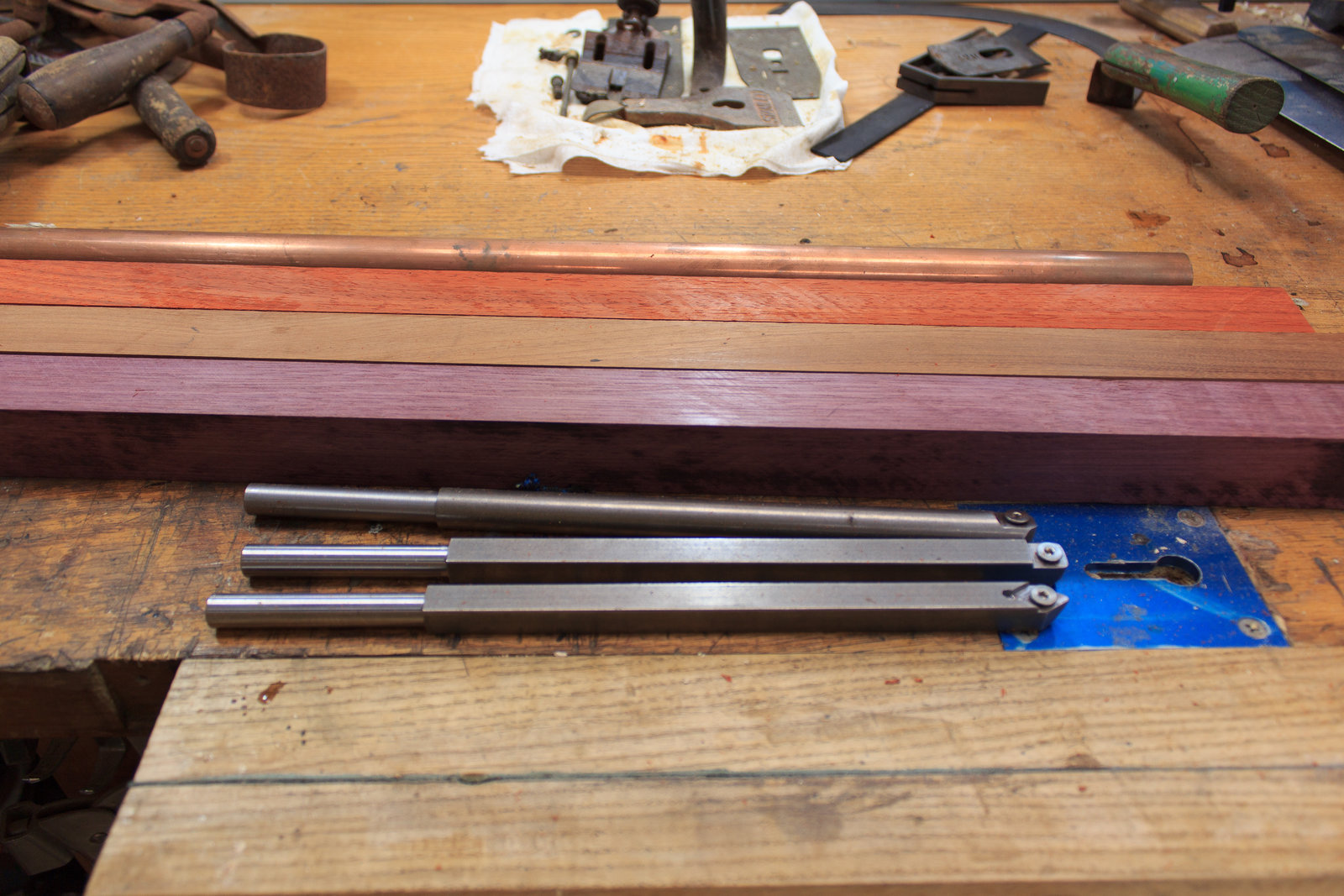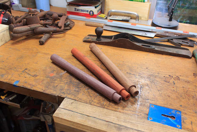 My handle stock has been squared up to 1.5"x1.5". They are 16" long. The woods I'm using are (from top to bottom): Padauk, Sapele, and Purpleheart