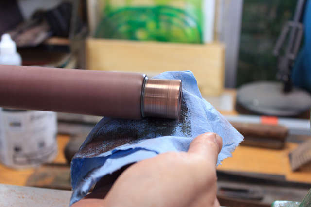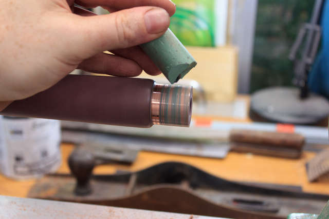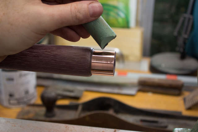 It's important to heat up the ferrule in this case because I apply a Chromium Oxide buffing compound. Allowing it to melt on makes for a nicer polish in my experience.