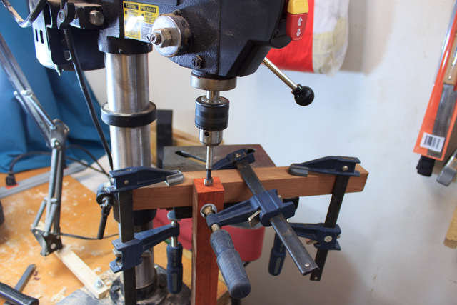 Get everything plumb and drill away! The carbide insert holders I used have a 1/2" shank. So I started the hole with a 1/2" forstner bit and finished with a 1/2" jobber.
