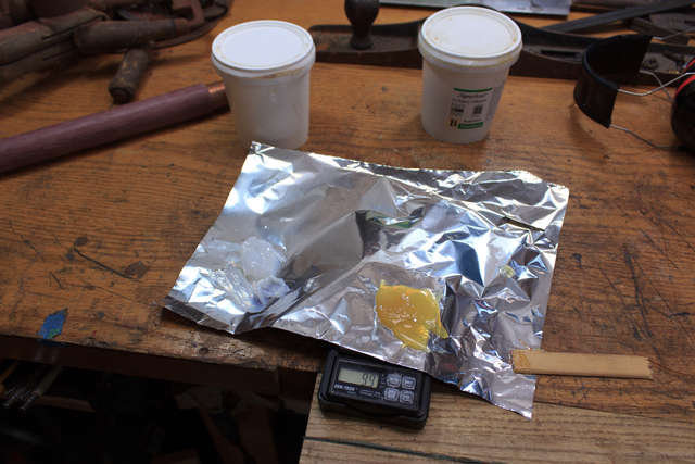 Here's a quick shot of how I like to mix small batches of epoxy. I simply put some aluminum foil on a scale and measure out the resin and hardner to 2 different sections. Make sure you look up the weight ratio of your epoxy. It's often not the same as the volume mixture. This epoxy is 1:1 by volume and 100:84 by weight. This is important