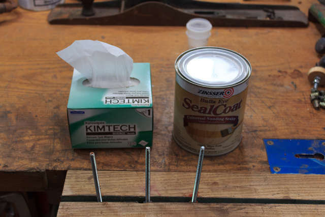 Here are 2 little tricks for you when finishing. Firstly I put 3 bolts in my vise so that I can dry the handles easily.