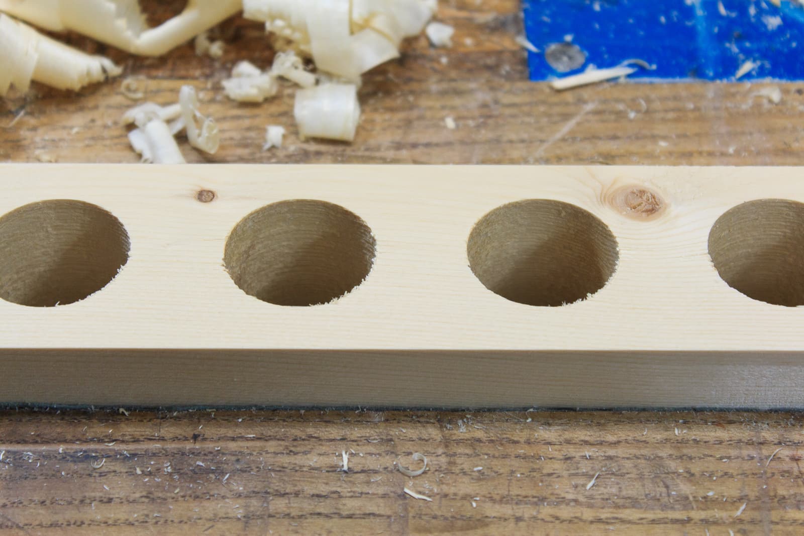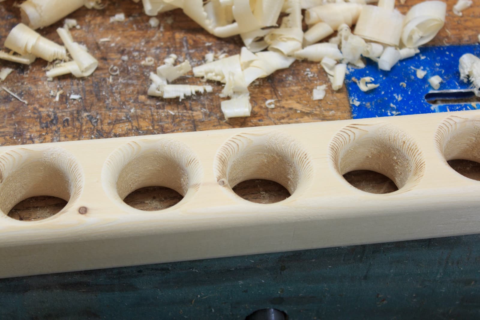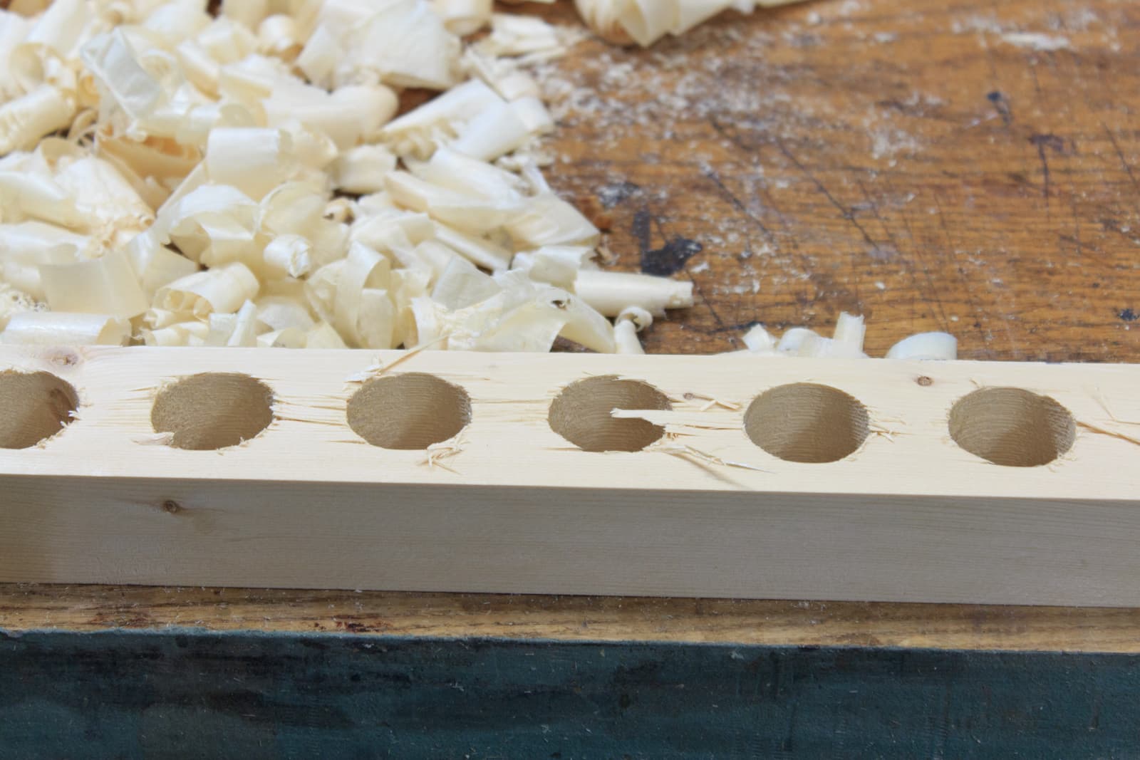 Now I drill holes at each mark using a 1.25"/3cm forstner bit. This is a lot of work!