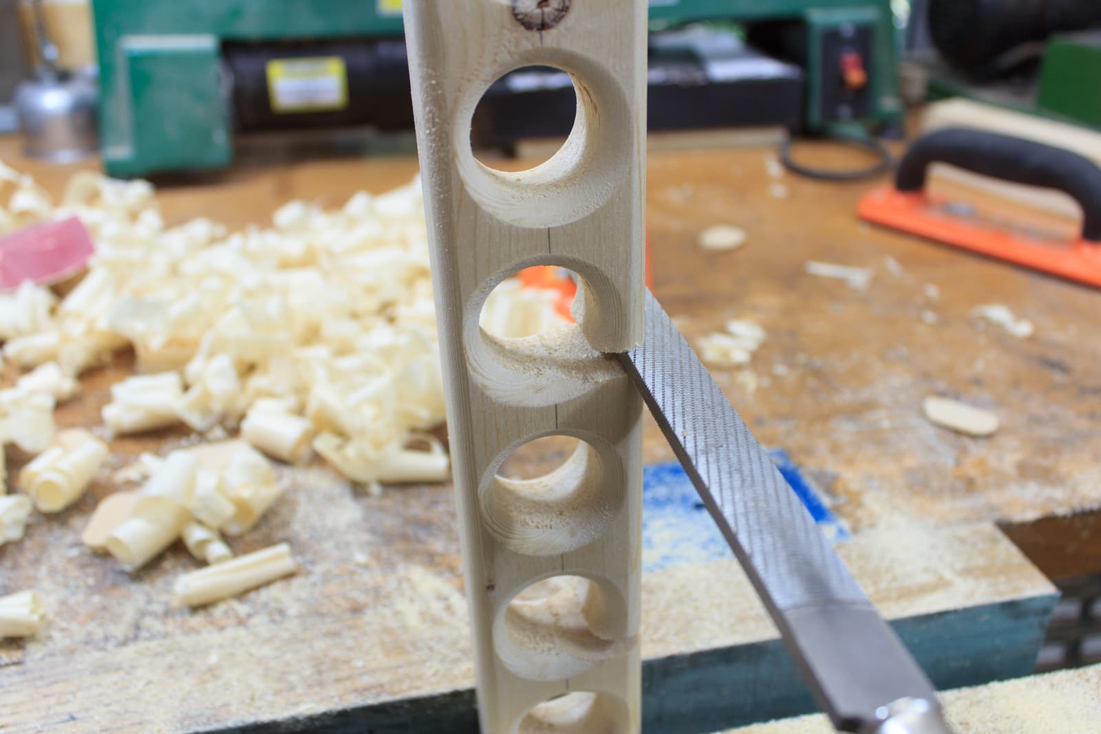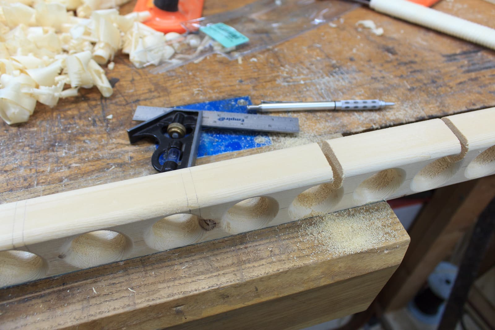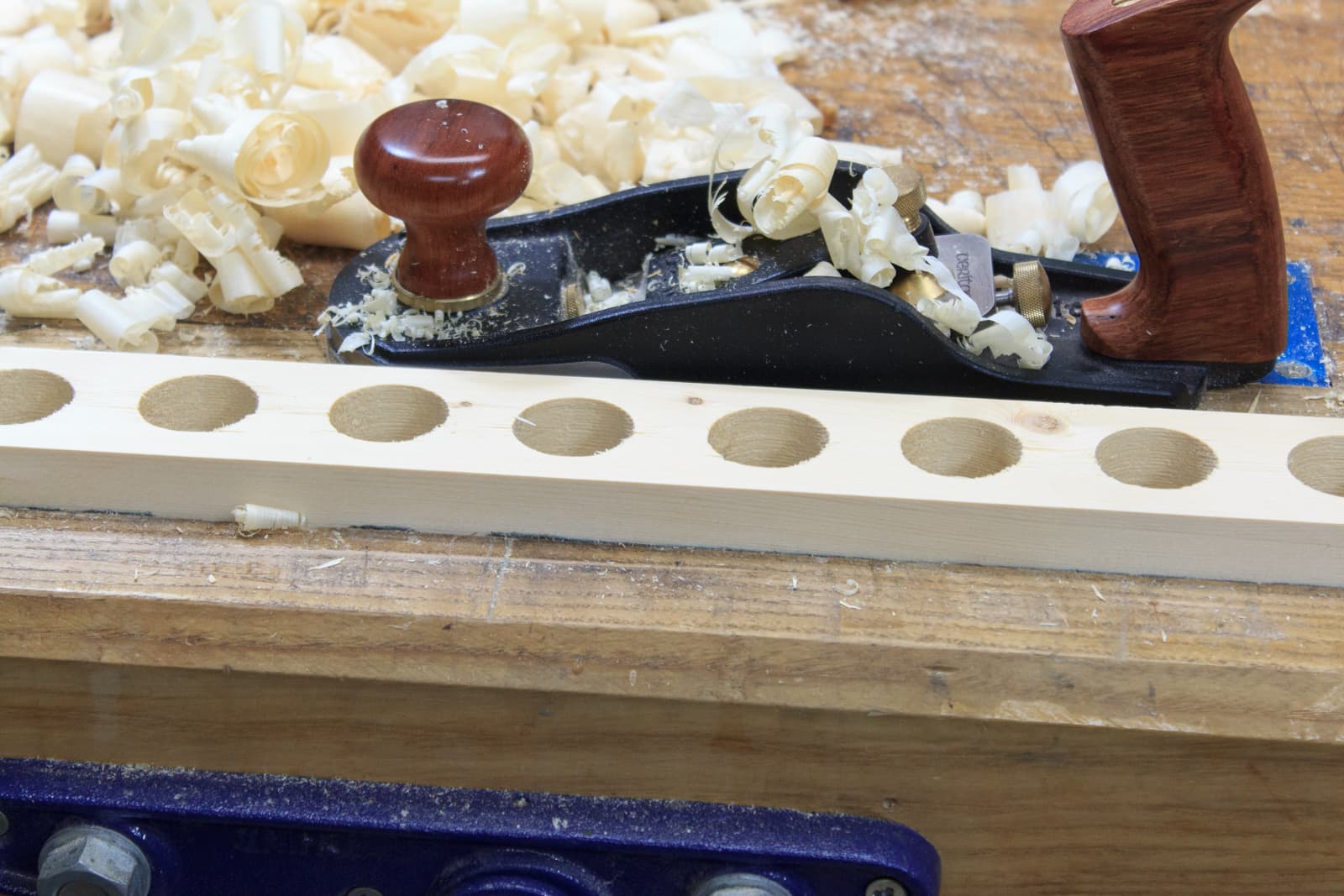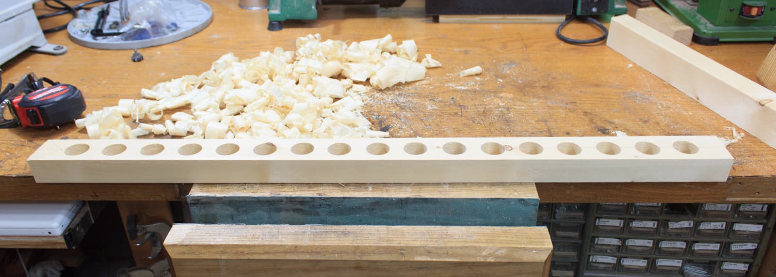 Now I drill holes at each mark using a 1.25"/3cm forstner bit. This is a lot of work!