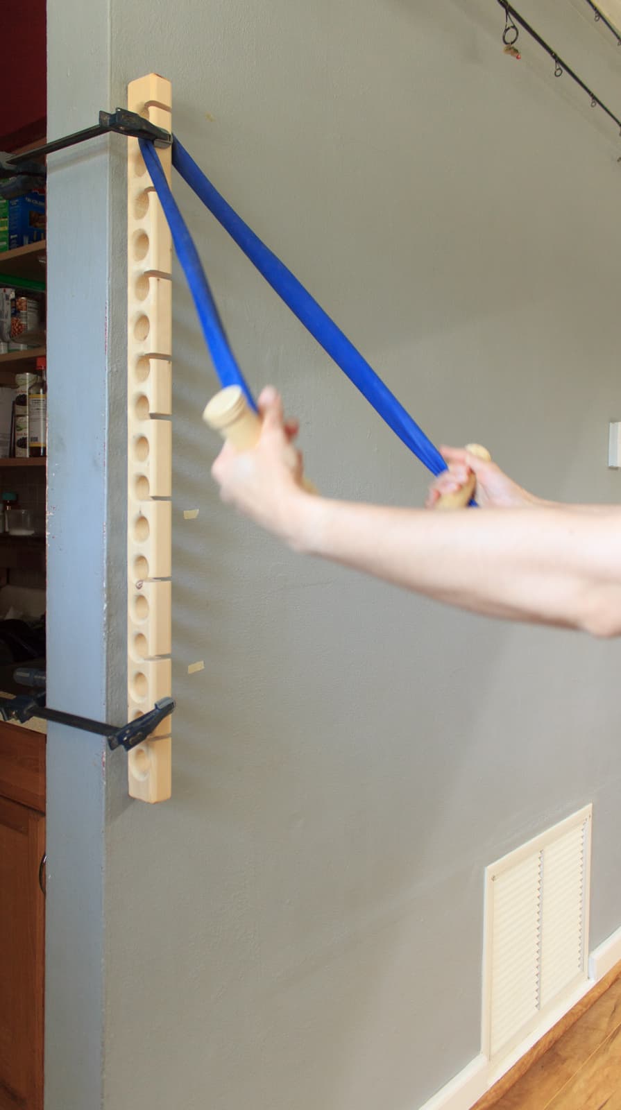 The rub is that the bands need to be held at certain positions, in various ways, so that she can pull on them. Our house is basically a labyrinth of workshops, we don't even have a living room. We're both artsy/crafty folk that don't have much of an interest in a "normal" house. The result is that there's only one place in the house where she can spread her arms out.
